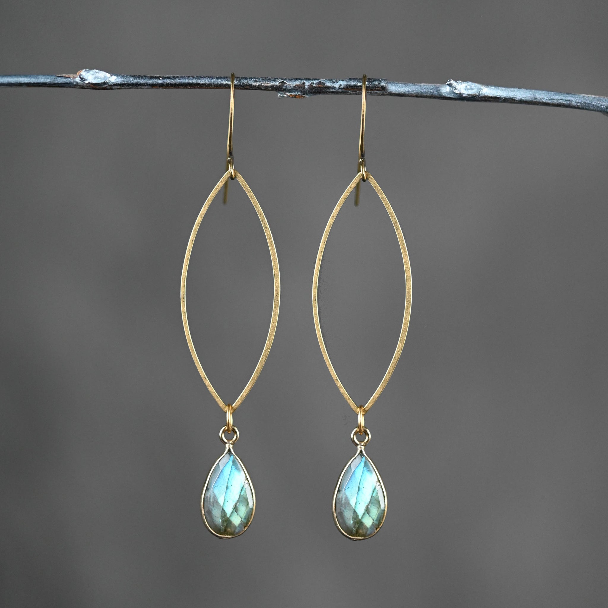 Brass Open Marquise Earrings w/ Labradorite Semi Precious Stone